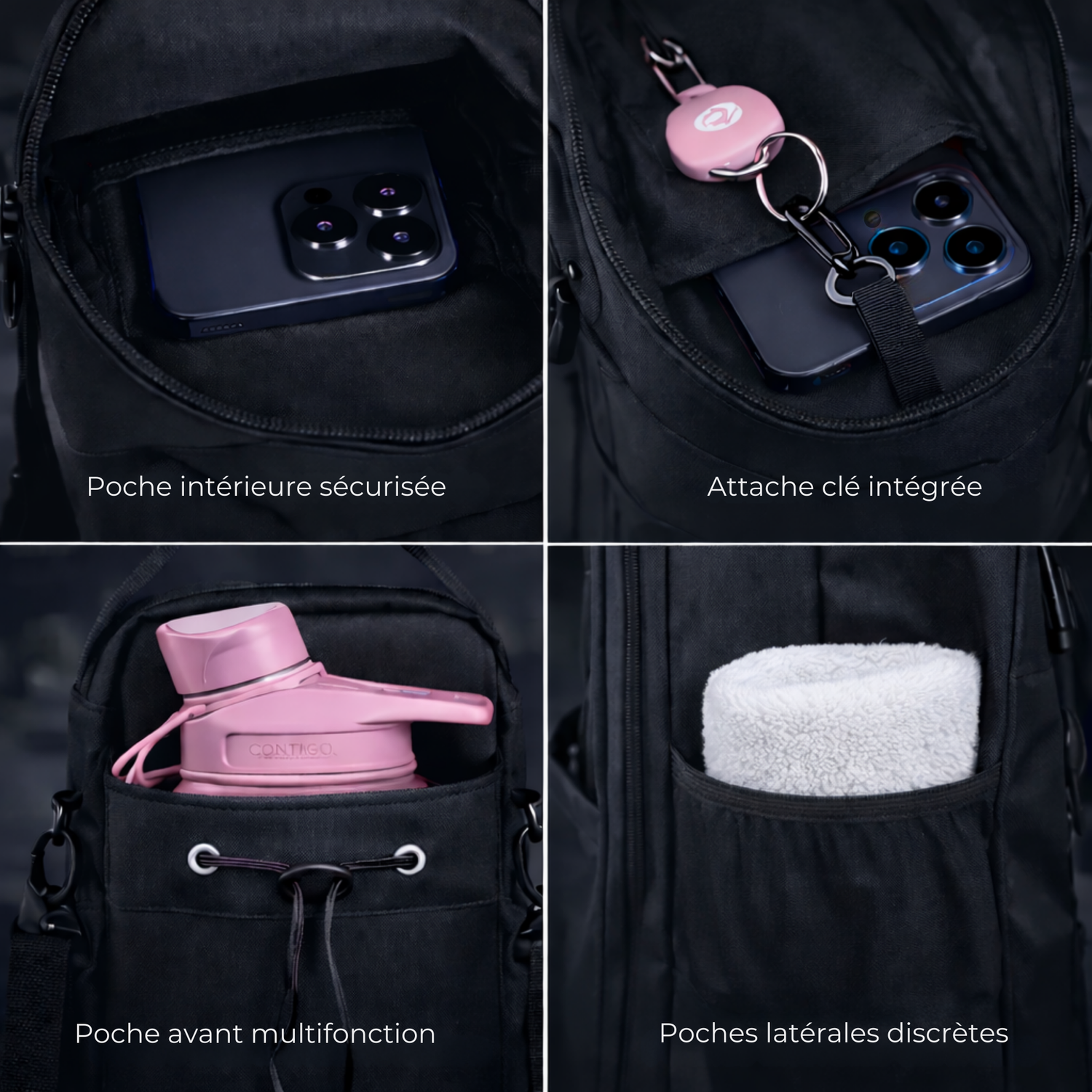 Téléphone, clés, gourde : tout est accessible sans interrompre ta séance.
